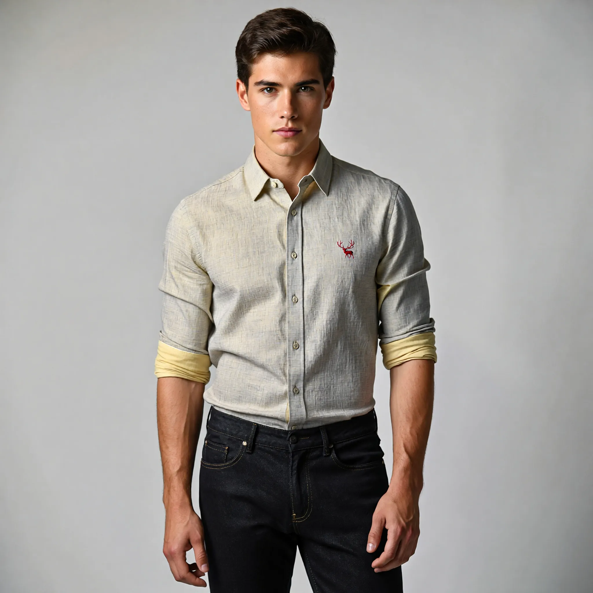 Prompt: Full body shot of a handsome young man posing for a high-end clothing brand. He is wearing a slim-fit stone-lemon oxford cotton shirt with a button-down collar and a tiny red embroidered deer logo on the left chest. The sleeves are neatly rolled to the mid-forearm. Tucked into tailored black denim jeans. Soft natural side-lighting creating subtle shadows that define the fabric texture. Clean, minimalist light-grey studio background. Professional fashion photography, 8k resolution, depth of field, high detail.