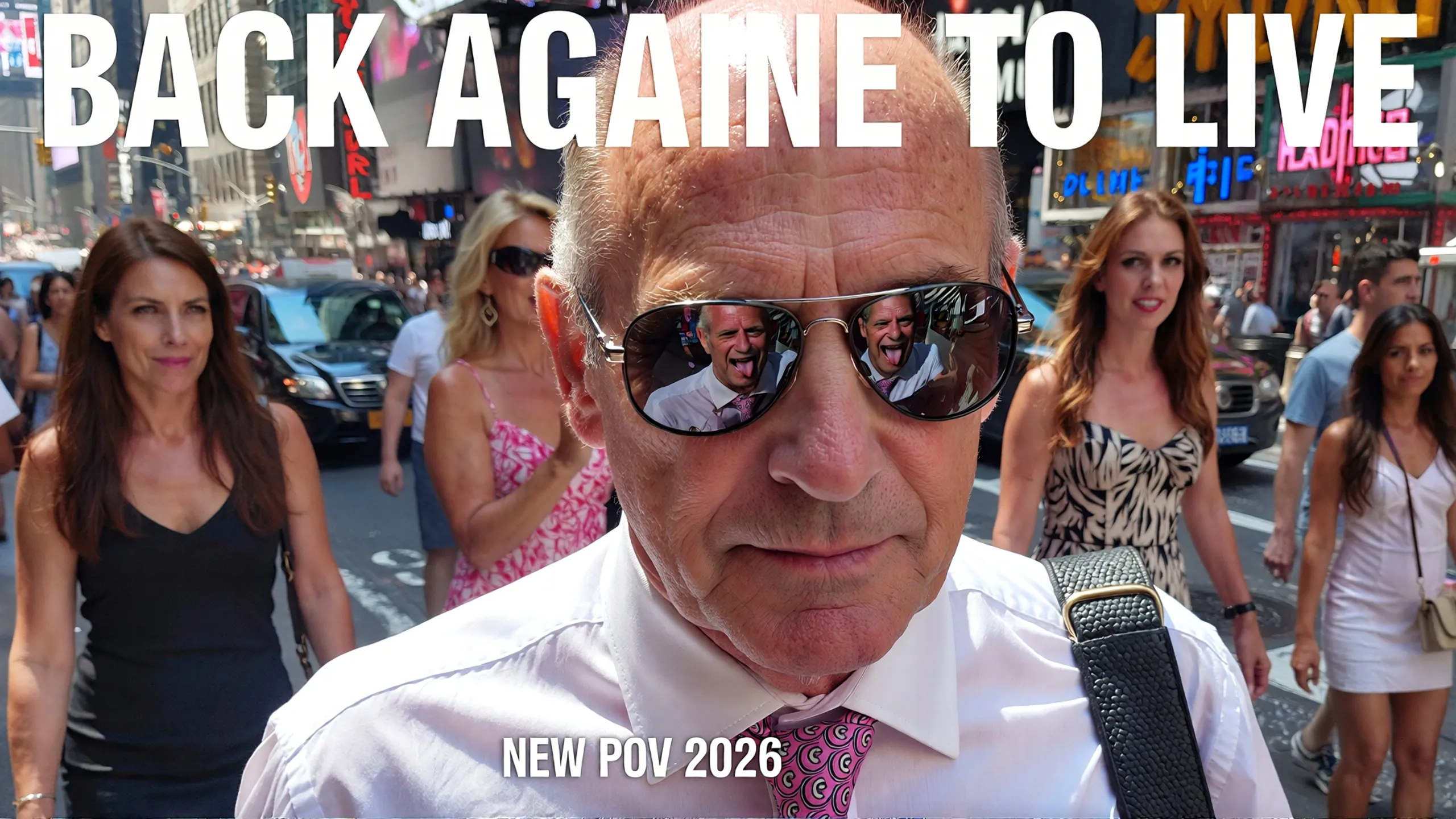 Prompt: The image is a digitally altered photograph featuring a close-up of a middle-aged man with a bald head. He is wearing dark sunglasses with a silver frame. The lenses of the sunglasses reflect a distorted image of the man making a silly face with his tongue slightly protruding and eyes crossed.The man is wearing a white collared shirt with a pink and white patterned tie. A dark strap, possibly from a bag or instrument, is visible over his left shoulder and across his chest. His skin is fair, and he has faint wrinkles around his eyes and mouth. He is looking directly at the camera with a neutral expression.Use reference uploaded photos to be realistic Live Photo after face replacement.The background is 5 hot babe models Girl in Manhattan’s time square street. Above the man’s head, in white capital letters, is the text “BACK AGAINE TO LIVE”. Below the man’s chin, also in white capital letters, is the text “NEW POV 2026”.The lighting appears to be artificial and focused on the man’s face, creating a slight shadow under his chin. The image has a meme-like quality due to the text overlay and the contrasting expressions. The overall image quality is moderate, with some slight pixelation visible upon closer inspection