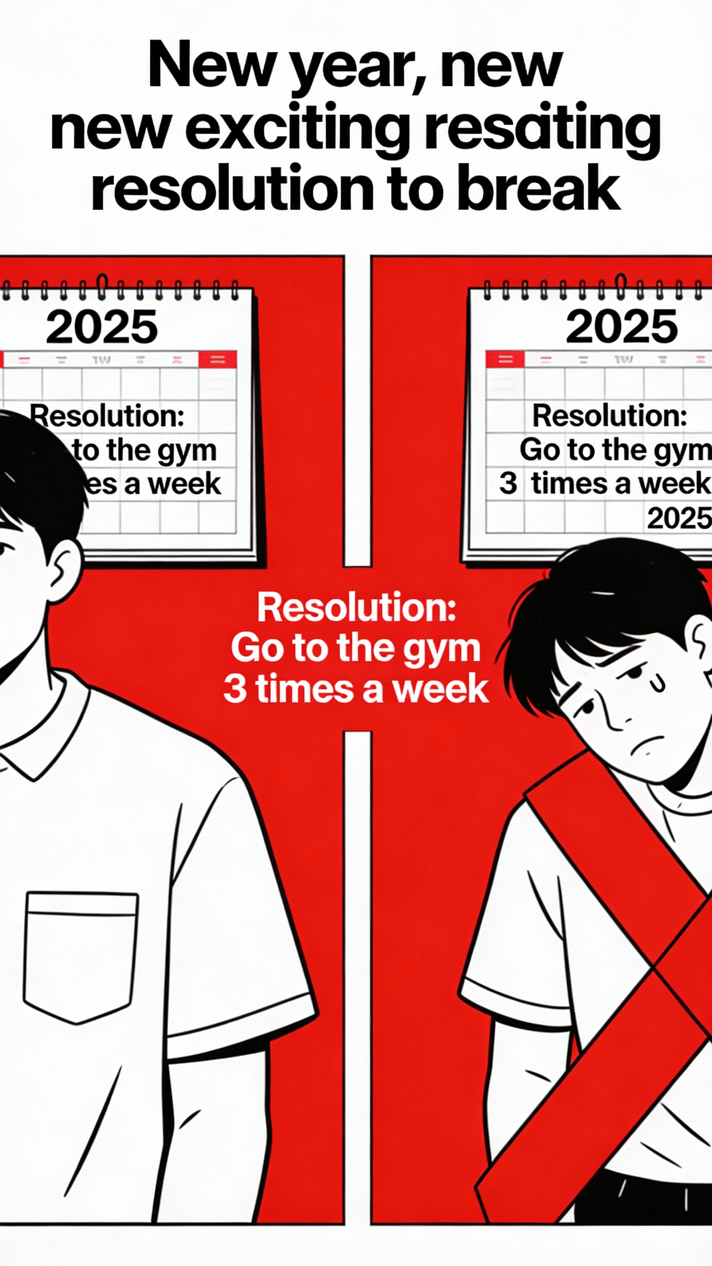 Prompt: Left side shoulder be the same person on the right crossing over the same resolution in the calendar in 2025. Meme caption change to “New year, new exciting resolution to break”