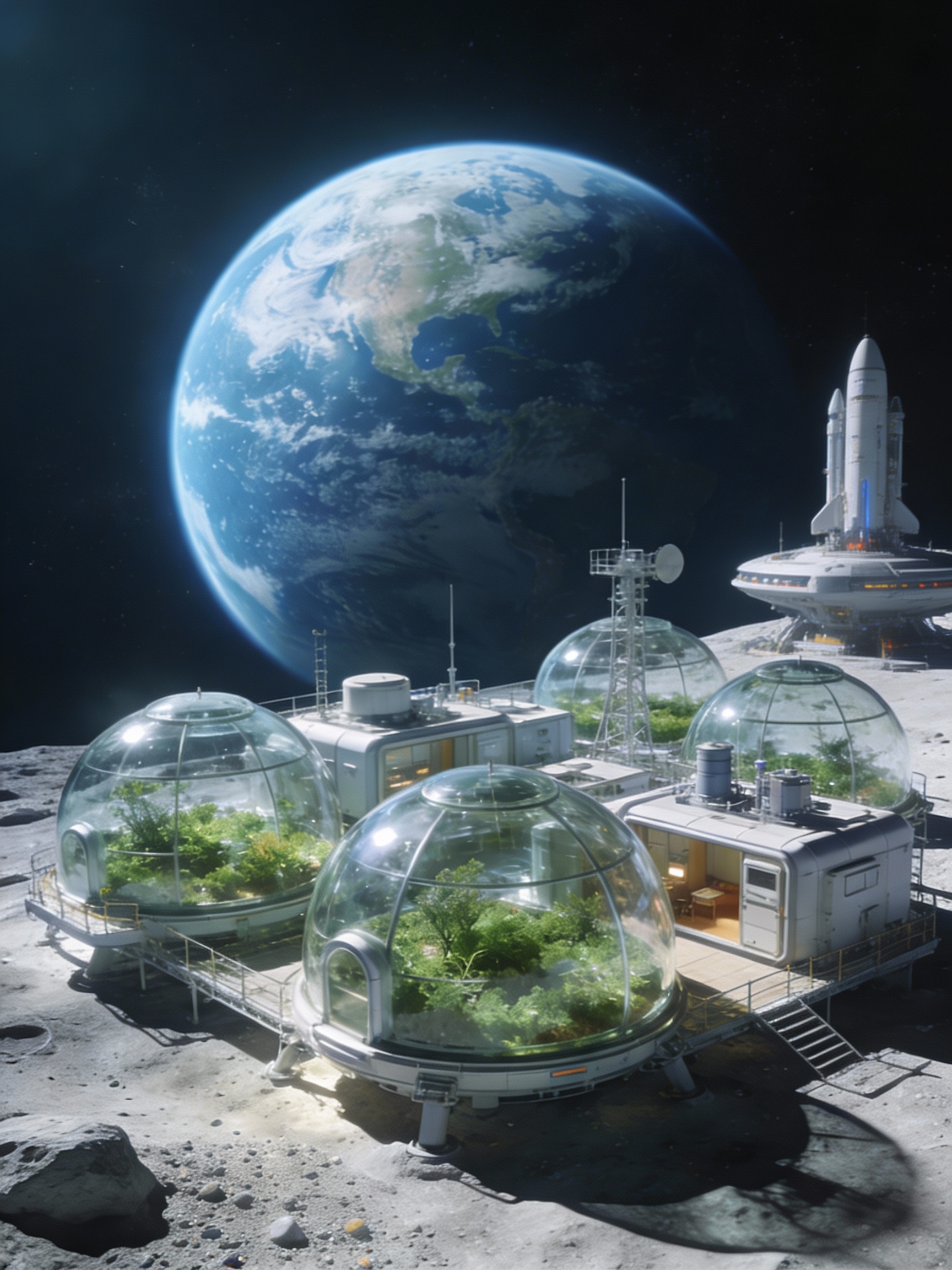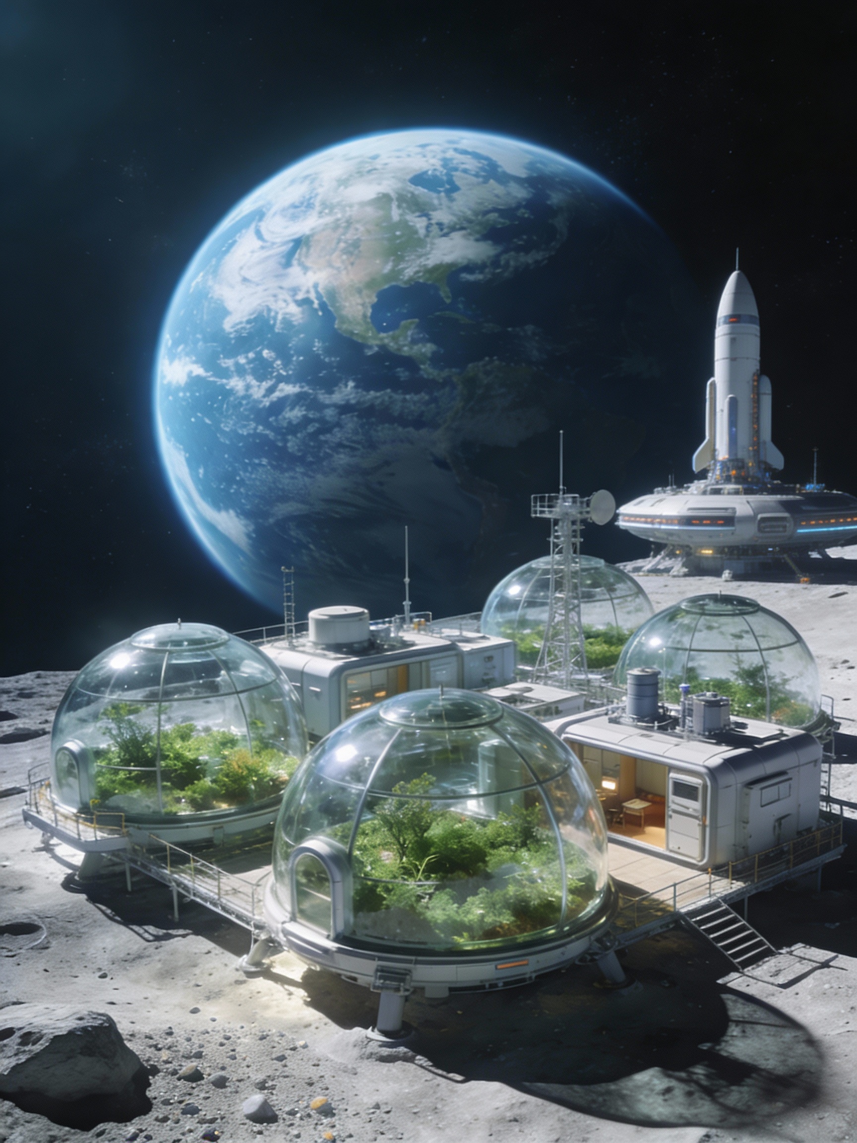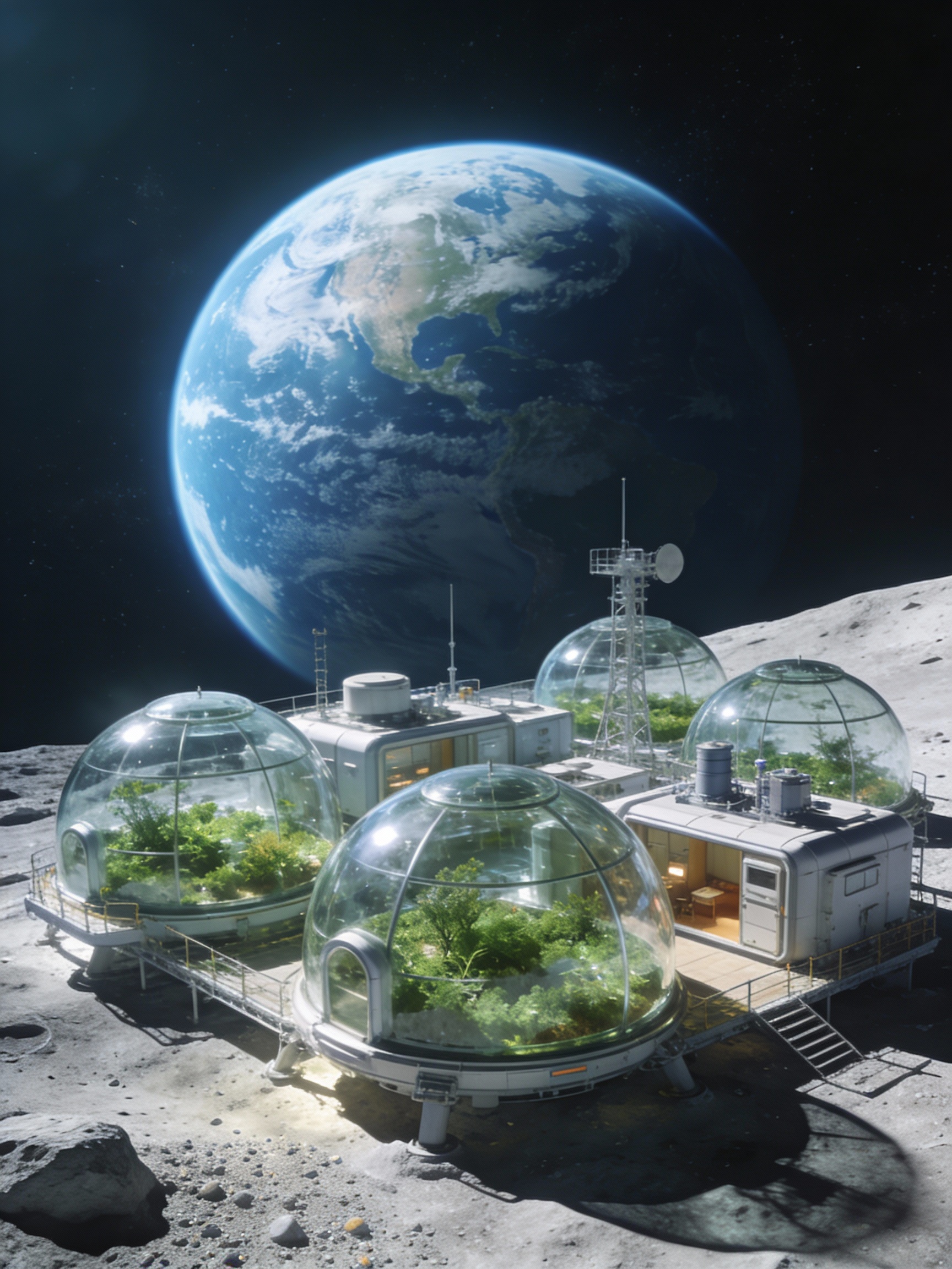 Prompt: A moon base with glass domes. Earth I the background.
