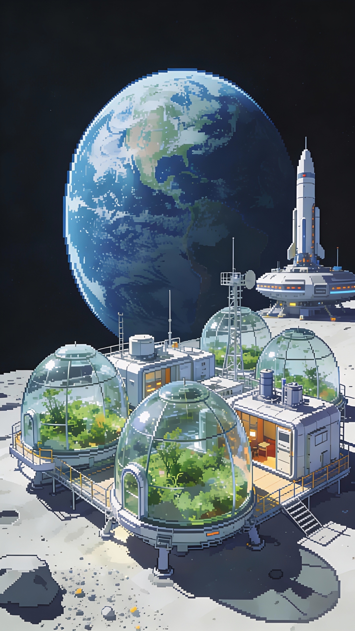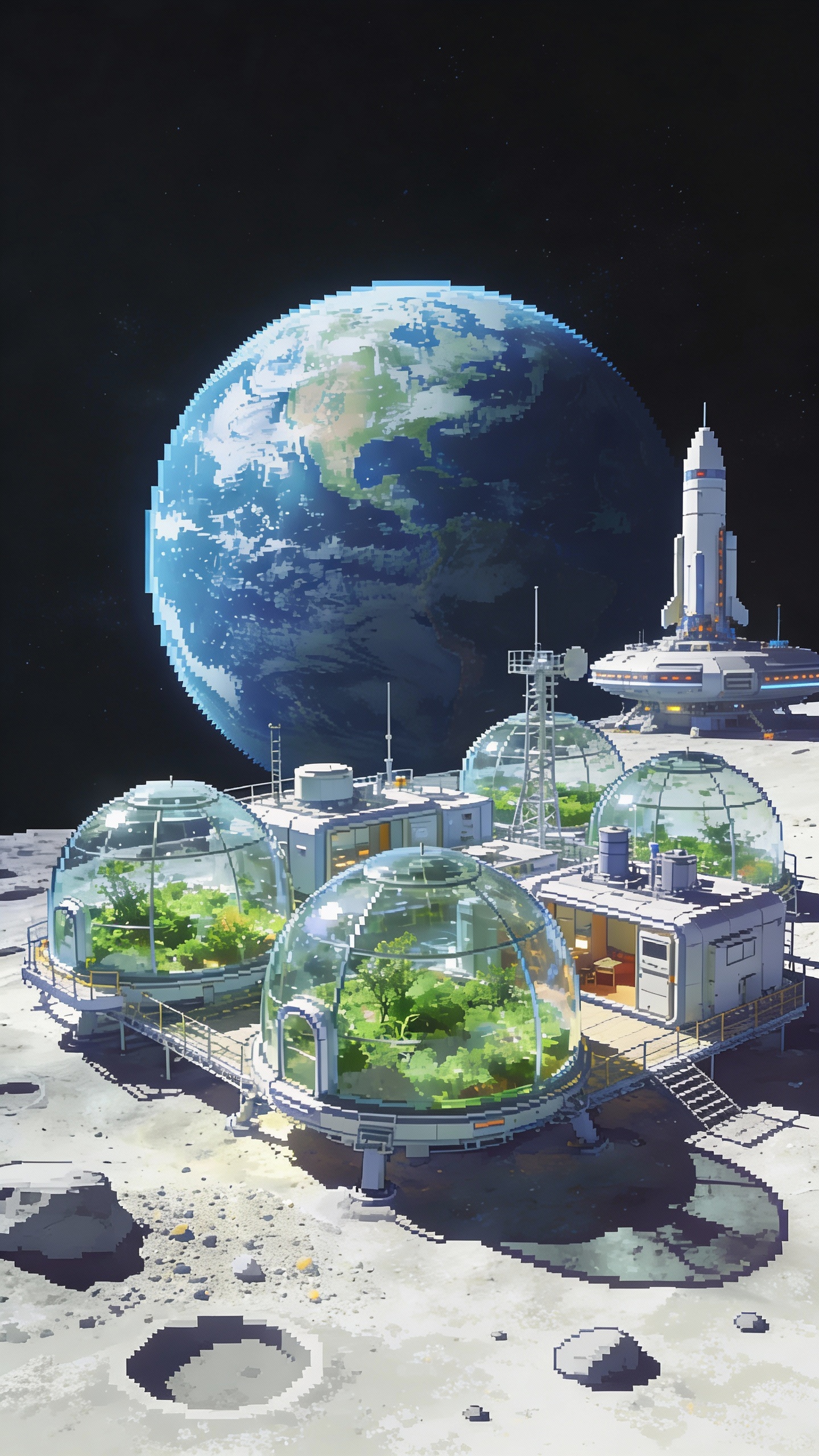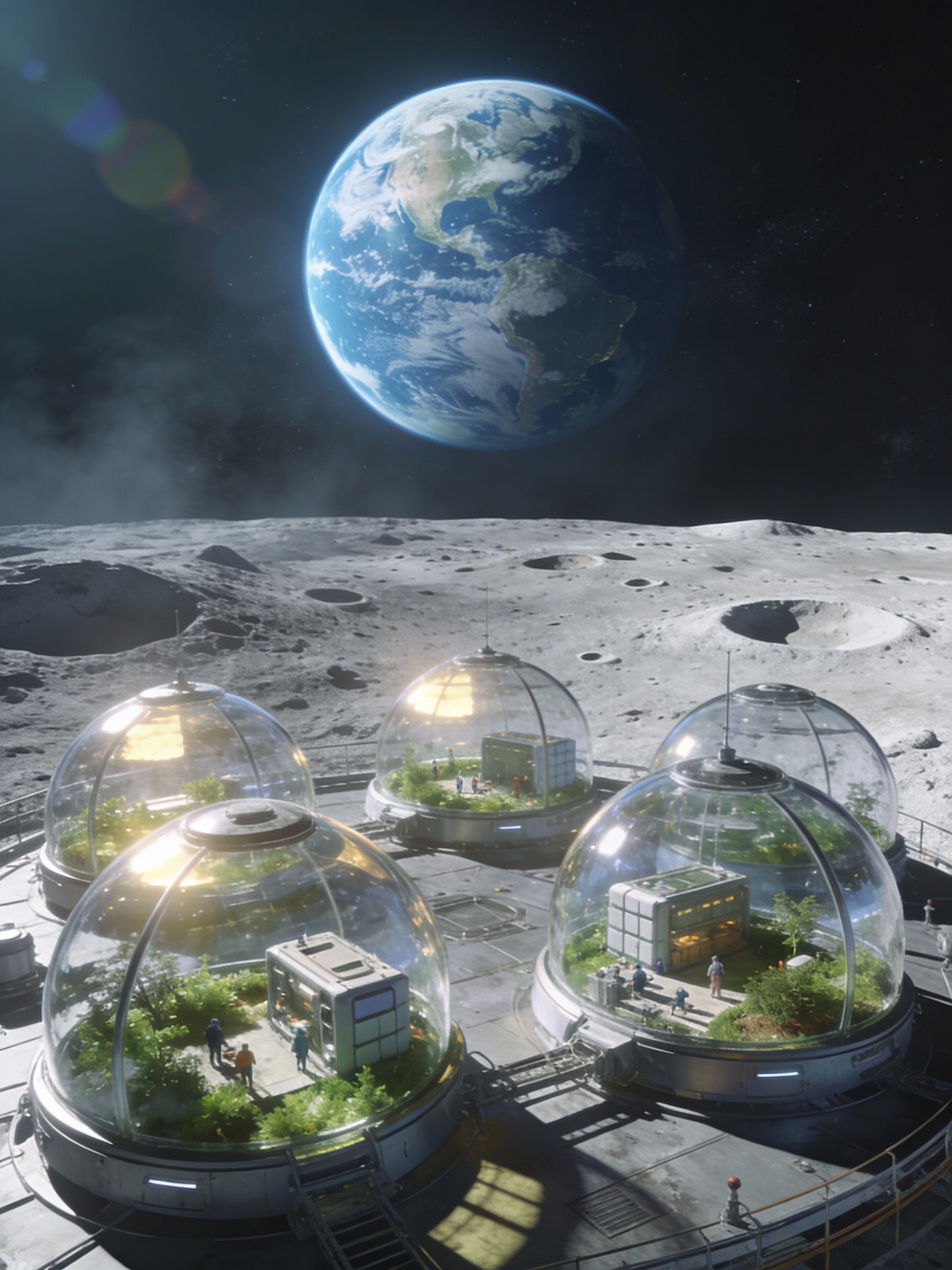 Prompt: A moon base with glass domes. Earth I the background.