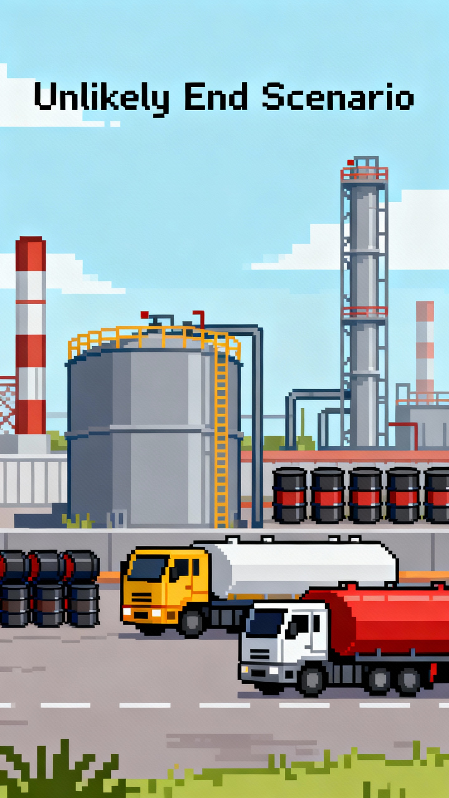 Prompt: Oil refineries, barrels, oil trucks. The text: “Unlikely End Scenario” on top of the image.