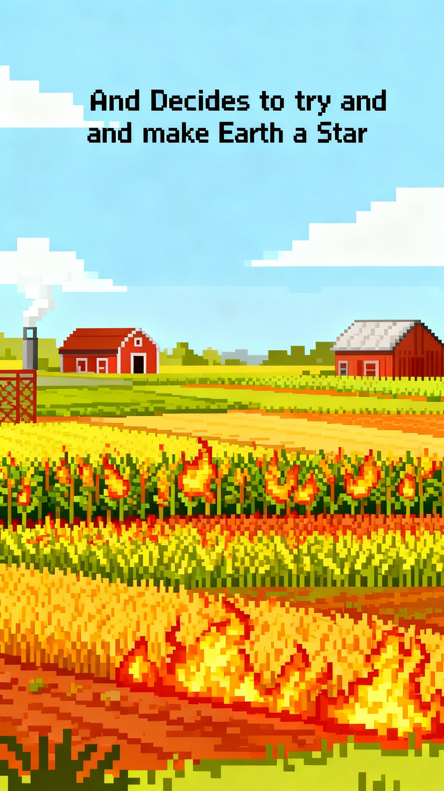Prompt: Change the text to “And Decides to try and make Earth a Star” and set the farmland ablaze