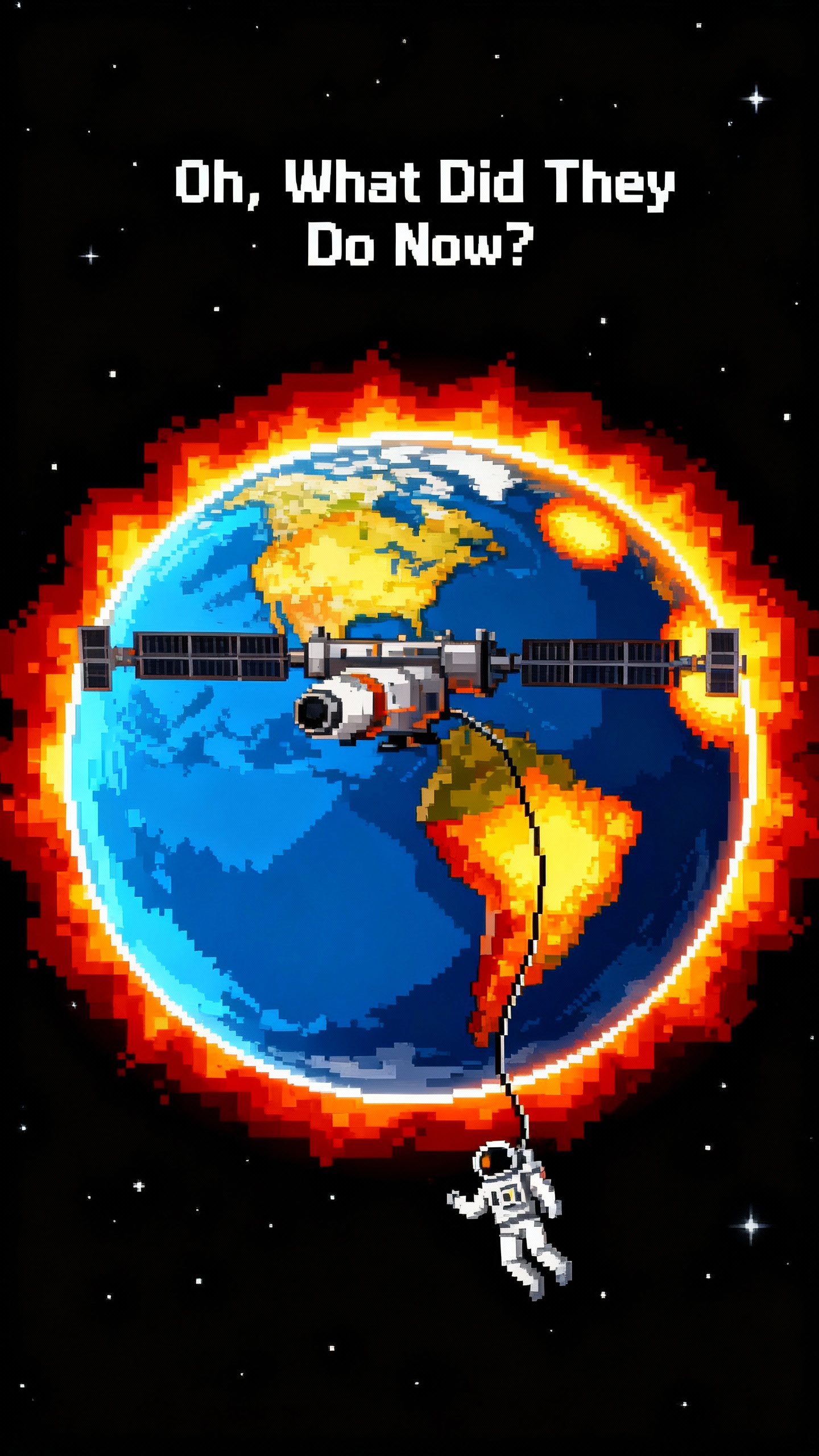 Prompt: Change the motif to show earth from space with a space station and an astronaut connected to it floating in space. With earth being ablaze looking partly like a sun. And change the text to white and say “ Oh, What Did They Do Now?”