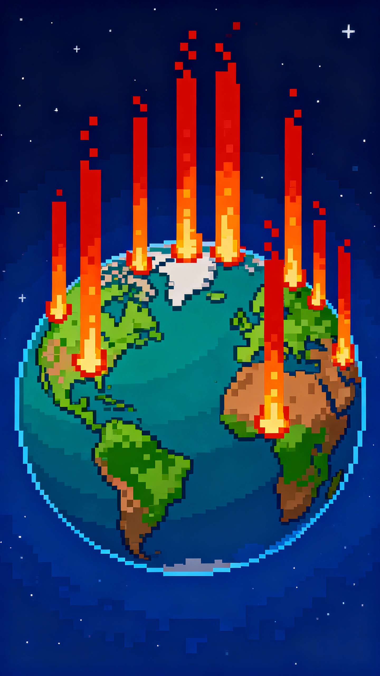 Prompt: the planet earth seen from space with all (non poles) continents burning with tall flames.