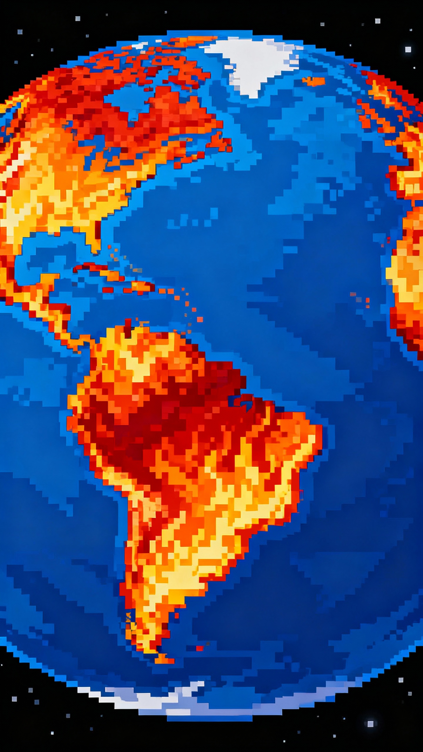 Prompt: the planet earth seen from space with all (non poles) continents burning. flames. blue oceans, colorful image.